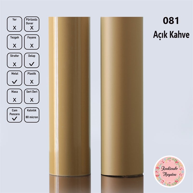 Kendinden yapışkanlı, silinebilir, kaplama folyosu. Düz ve pürüzsüz yüzeyler için uygundur. Su, nem ve sıvı yüzey temizleyicilere karşı dayanıklıdır, rahatlıkla silebilirsiniz. Dolap, Cam, Metal gibi pürüzsüz yüzeyleri kaplayabilirsiniz.