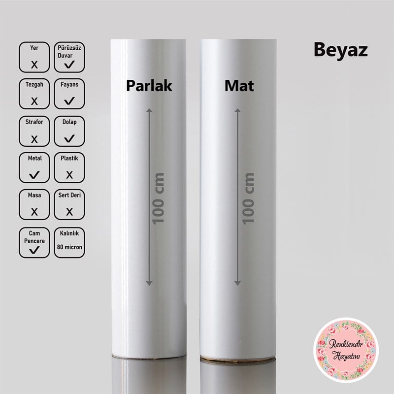 • Beyaz renk folyonun arkası gri renktedir. Uygulandığı koyu zeminin rengini belli etmez %100 kapatıcı özelliği vardır.